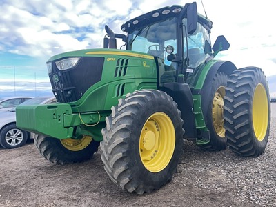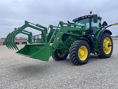 ID# 2247 2017 John Deere 6175R MFWD 442 hours, MFWD, IVT, left hand reverser, TLS front suspension, 4 hydraulics, 540/1000 PTO, diff lock, 4200 processor, 7" display, basic activation, LED lighting, 480/80 R46 rear tires, with John Deere H380 self leveling loader, Mark 701-490-1008 |